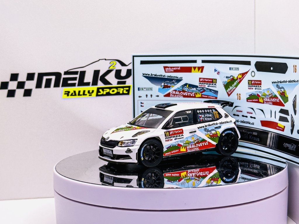 Unikátní sada decalů pro model vozu Škoda Fabia R5 Míry Plíhala, který se představil na Pražském Rallysprintu 2022 s navigátorem Tomášem Krausem.